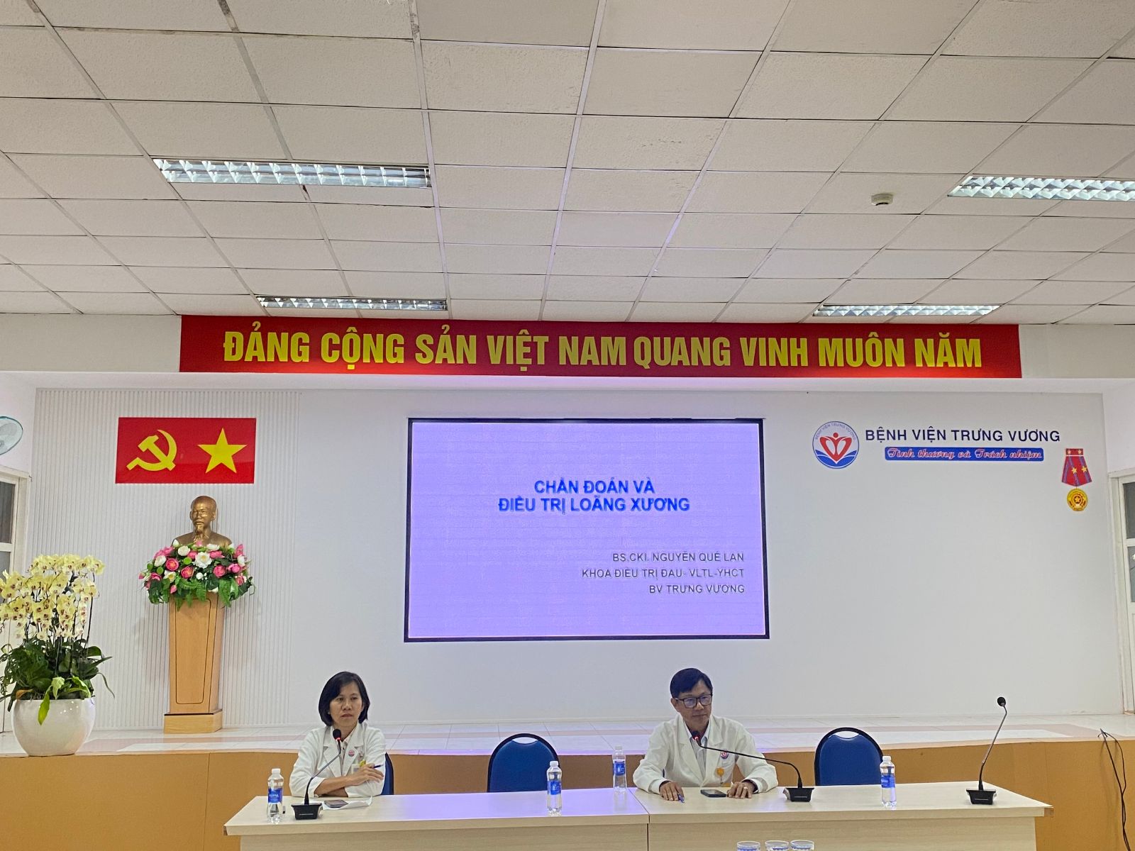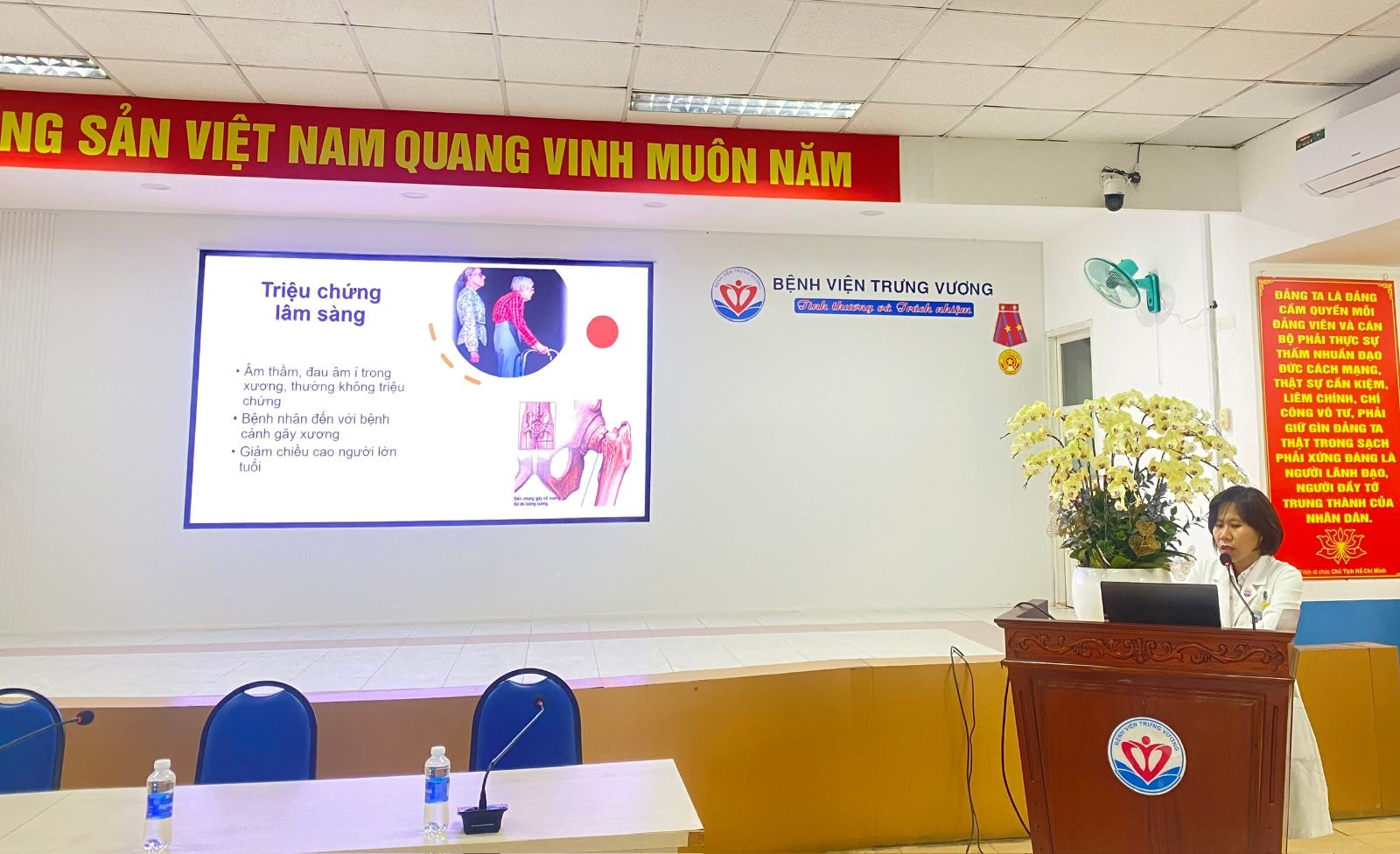Vào 10 giờ ngày 18/03/2026, Bệnh viện Trưng Vương tổ chức buổi sinh hoạt khoa học kỹ thuật với các chủ đề: “Chẩn đoán và điều trị loãng xương” do BS.CKI Nguyễn Quế Lan – Phó Trưởng khoa Điều trị đau – Vật lý trị liệu – Y học cổ truyền báo cáo và báo cáo “Tổng quan chuyên đề xuất toán BHYT quý 4/2025” do DS Đào Ngọc Thủy Tiên – Khoa Dược trình bày. Buổi sinh hoạt có sự tham dự của: