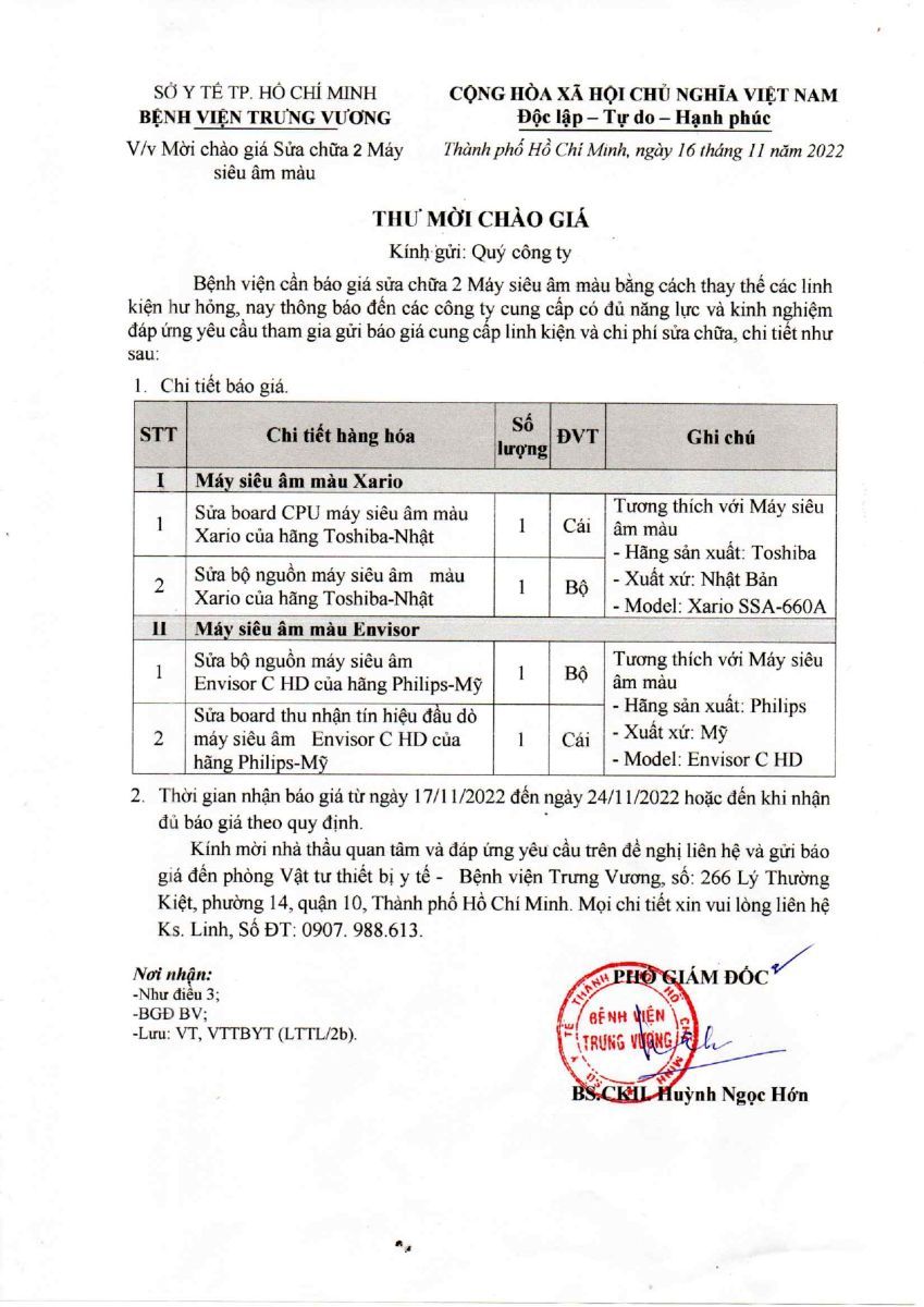 Bệnh viện Trưng Vương mời chào giá Sửa chữa 2 Máy siêu âm màu
